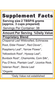 • Made with USDA Organic Ingredients: Echinacea, Elder Flower, Hyssop, Raspberry Leaf, Red Clover, Yarrow, Yellow Dock, Burdock, Chamomile, Cornsilk, Organic Flavor, Licorice Root, Plantain, Valerian, Stevia